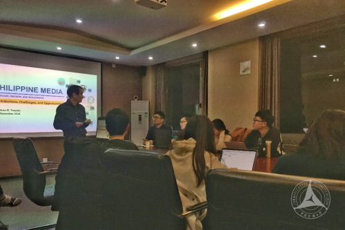 分享结束后,在场员工积极提问,与Ramon Tuazon教授就记者的人身安全、商业媒体主导的国家中信息娱乐化等问题进行了讨论。Ramon Tuazon教授目前担任亚洲新闻与传播协会(AIJC)主席、亚洲信息与传播中心(AMIC)秘书长等职。他曾以多种身份为联合国教科文组织服务,并带队参加有关大众媒体、儿童权利等领域的国际研究。