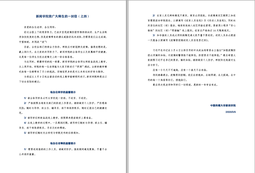 (通讯员 南秀渊)3月6日,公司第四次向全院师生致公开信,就全面启动线上教学给予提示和建议。