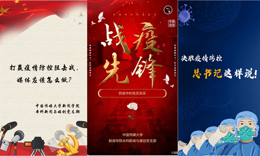本科新闻与媒创党支部率先开展线上政治理论学习,主题涉及疫情防控中总书记的讲话、优秀党员的先锋模范行动和媒体表现等。党小组还根据学习心得,制作了《决胜疫情防控 总书记这样说》《战疫先锋 防疫中的党员风采》《打赢疫情防控阻击战 媒体应该怎么做》等H5作品,汇编学习成果,提高认识,坚定信心,争取在抗疫行动中更加充分地发挥党员作用。