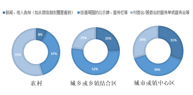 居住地不同,河长制的宣传方式也有所区别,超过半数的农村居民了解河长制的途径是通过村委会成员上门走访、发宣传单或是村里召开的会议;而城市居民更多的是通过河边的公示牌和微信朋友圈获得信息。可以看出,相比城市居民,农村居民了解河长制的途径更加直接,面对面宣传的效果更好。