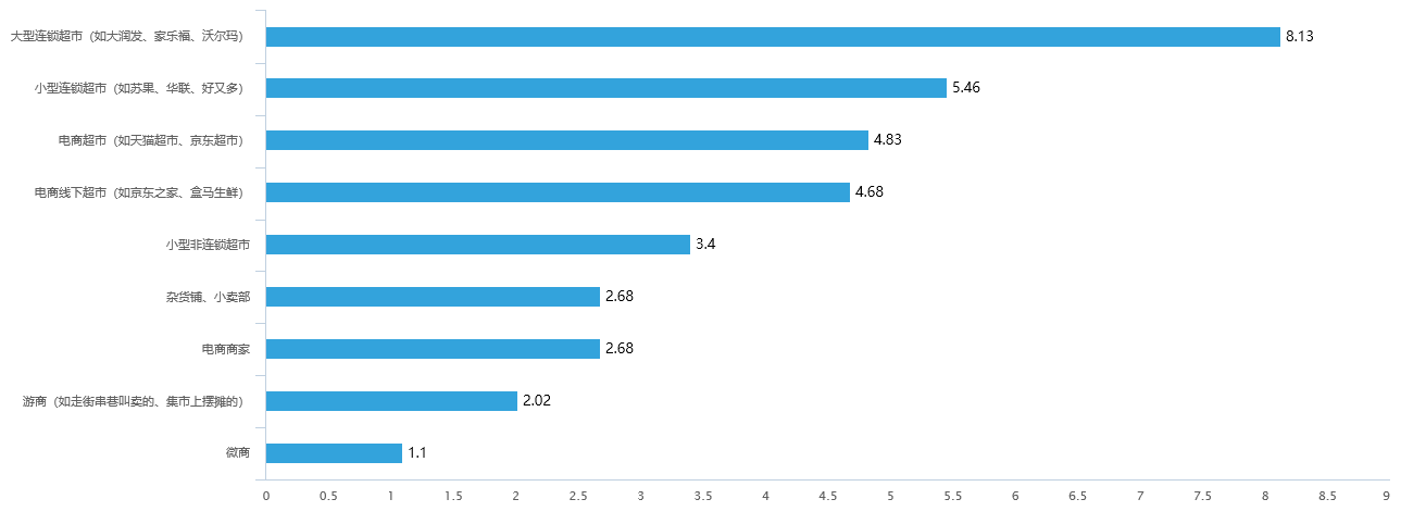我们收集到的问卷显示,对各种零售类型的信任排序呈现“大型连锁超市”、“小型连锁超市”、“电商超市”、“电商线下超市”、“小型非连锁超市”、“小卖部”、“电商商家”、“游商”、“微商”依次递减的趋势,其中“小卖部”和“电商商家”并列倒数第三。小卖部作为有正常营业执照的实体店却面临着和电商商家的网上商店以及无营业执照的游商一样的信任危机,难免令人唏嘘不已。