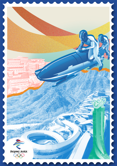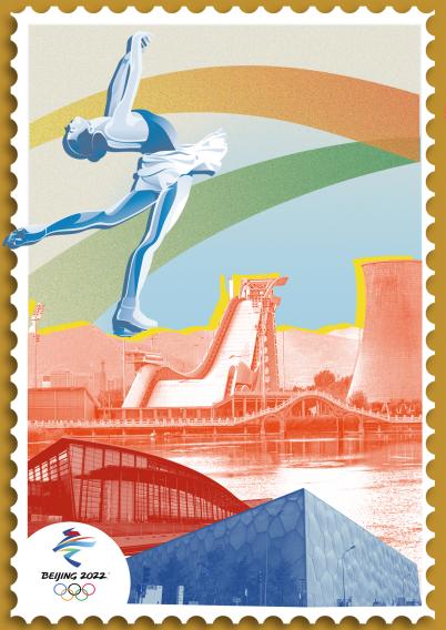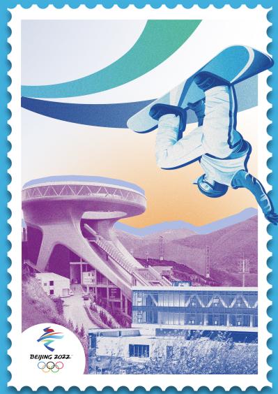 《集彩冬奥——拼贴冬奥印记》(作者:刘嘉宁、郭文清,指导教师:柳帆)作品共三张,分别展示了2022年北京冬奥会三个赛区的场馆以及对应的典型项目,期待在展现北京现代化建筑美感的同时,为人们留下三个赛区的特色印象。色彩选择多样化,以冬奥会和冬残奥会的官方配色为主色调,通过视觉上色彩的碰撞传达“青春”“运动”的含义。青春的色彩运用与现代的拼贴风格相结合,意在展示冬奥会冰雪运动的动态魅力,弘扬奥林匹克精神。作品整体选择邮票样式,借“集邮”表达“集彩”之义,背景借中国书法“冬”字的笔画,将抽象的滑道、冰雪运动与书法相结合,用飘带样式进行视觉呈现,与运动员相称。既呼应了冬奥主题,又借飘带样式传达了“连接”、“沟通”之义,蕴含着中国向世界发出诚挚邀约,与世界人民一起,向美好未来前进的冬奥主旨。