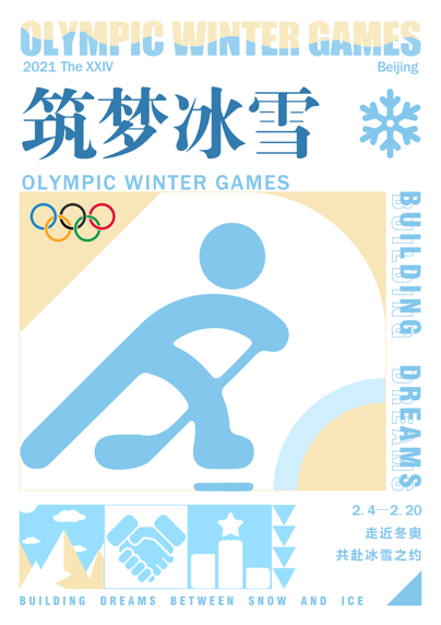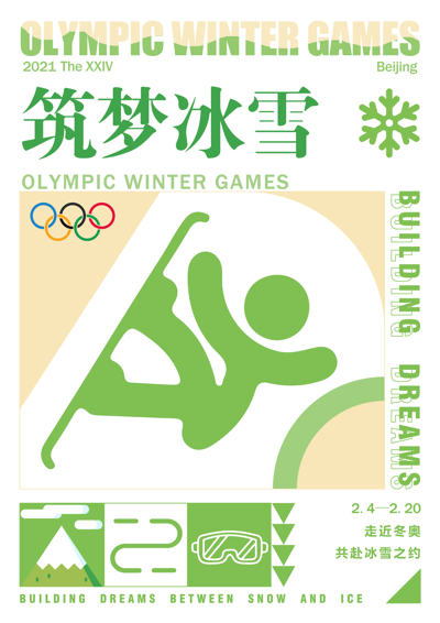 《共赴冰雪之约》(作者:宋萌萌、刘傲雪,指导教师:罗琳)系列海报以“筑梦冰雪·相约冬奥”为主题,采用扁平化、矢量风格设计,从竞技、冰雪、奥运、筑梦四个角度出发,将与冬奥相关的多重元素如冰雪运动项目标志、场地等融合其中,表达对北京冬奥盛会顺利举办的美好祝愿,以及对奥林匹克精神“团结,和平,进步”的赞颂。