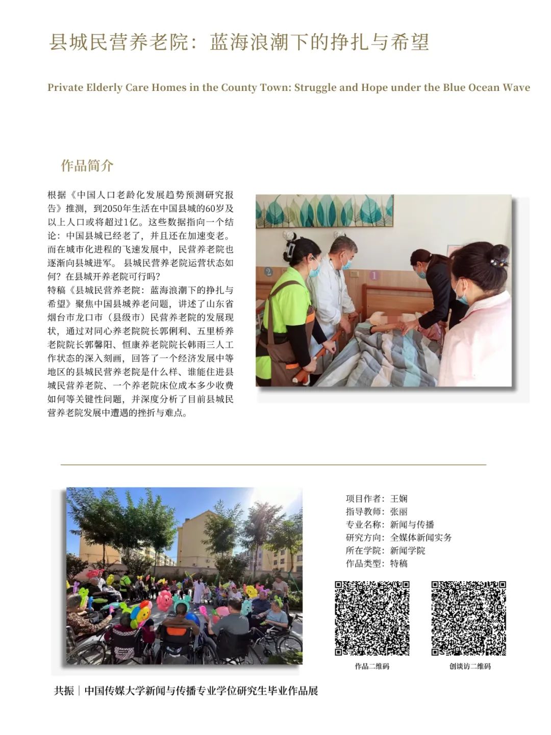 该作品聚焦中国县城养老问题,讲述了山东省烟台市龙口市(县级市)民营养老院的发展现状,通过对同心养老院经理郭俐利、五里桥养老院经理郭馨阳、恒康养老院经理韩雨三人工作状态的深入刻画,回答了一个经济发展中等地区的县城民营养老院是什么样、谁能住进县城民营养老院、一个养老院床位成本多少收费如何等关键性问题,并深度分析了目前县城民营养老院发展中遭遇的挫折与难点。
