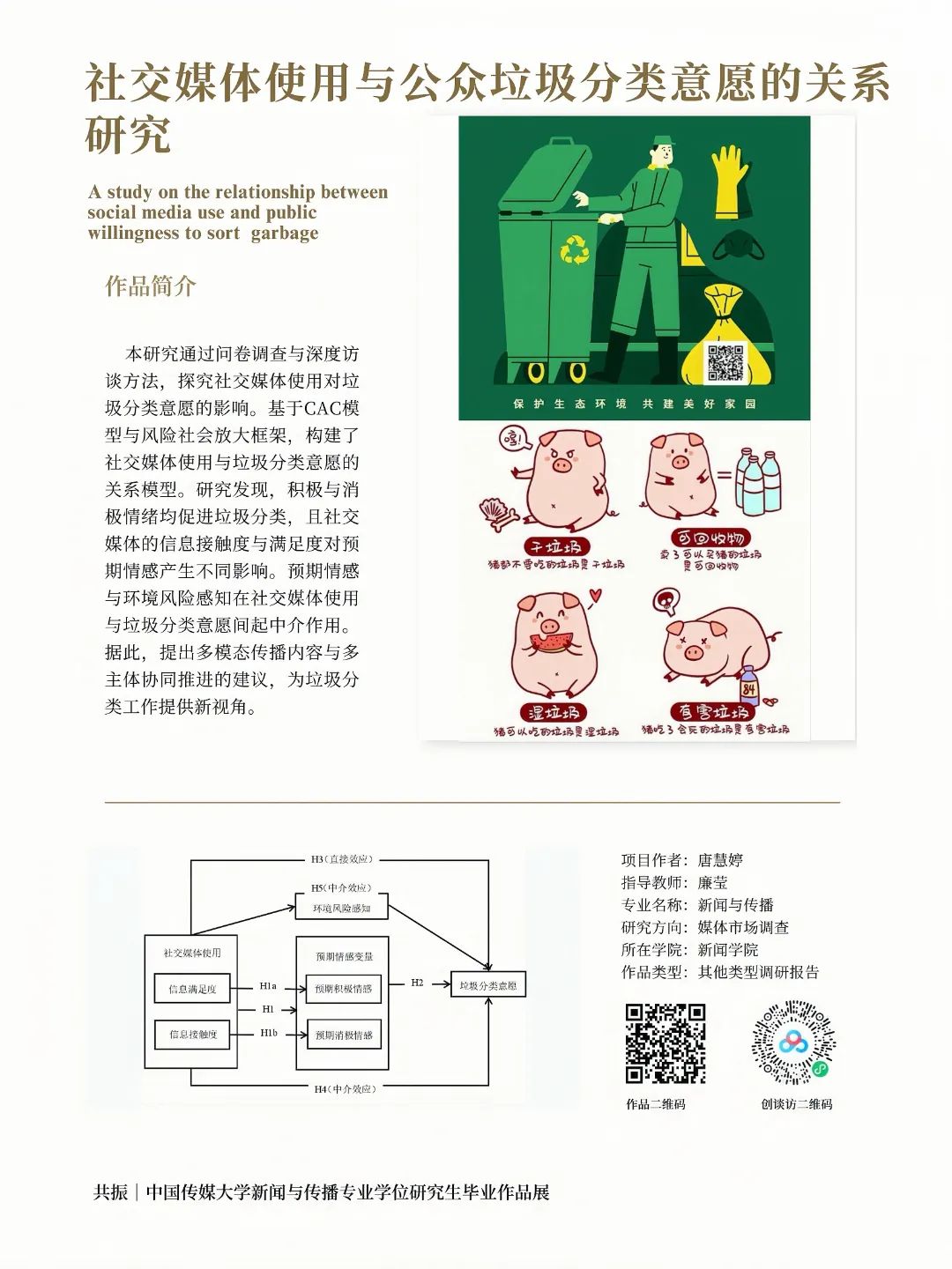 本研究通过问卷调查与深度访谈方法,探究社交媒体 使用对垃圾分类意愿的影响。基于CAC模型与风险社会放大框架,构建了社交媒体使用与垃圾分类意愿的关系模型。研究发现,积极与消极情绪均促进垃圾分类,且社交媒体的信息接触度与满足度对预期情感产生不同影响。预期情感与环境风险感知在社交媒体使用与垃圾分类意愿间起中介作用。据此,提出多模态传播内容与多主体协同推进的建议,为垃圾分类工作提供新视角。